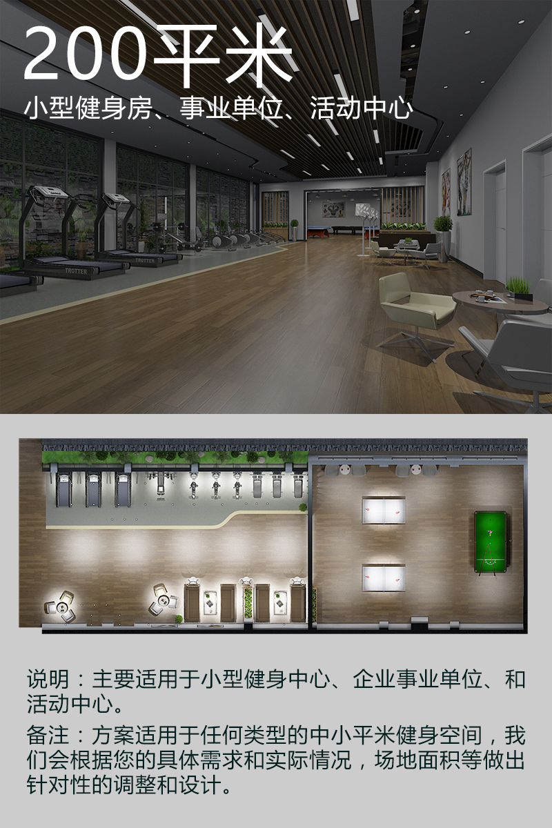 針對企事業單位活動中心的200平米健身房配置方案,需要充分考慮職工的需求、使用便捷性、空間利用效率以及整體氛圍的營造。以下是一個綜合性的配置方案: