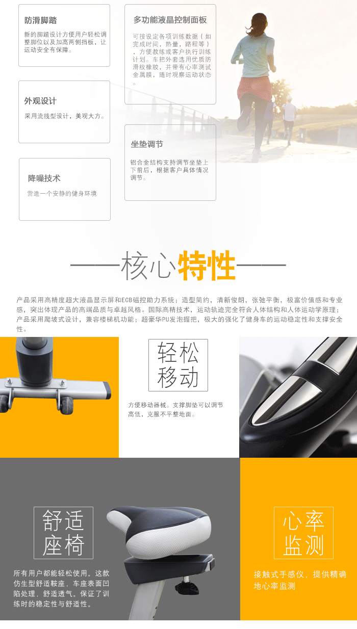 | 心率顯示 | 實時顯示心率,輸入年齡和體重後,可幫助用戶保持在燃脂、有氧或峰值目標區域中,更有效地進進行心肺訓練和減重。 |