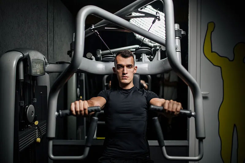 2、坐式推胸訓練器:坐式推胸訓練器是一種常見的固定練胸肌器材,鍛煉部位包括:胸大肌,三角肌,肱三頭,肱二頭肌等。操作簡單,安全性高,特別適合初學健身愛好者。