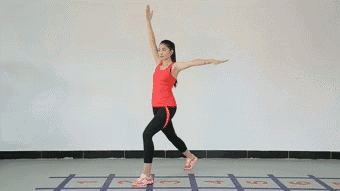 動作解析:在普通前弓箭步接後弓箭步基礎上,增加了單手上舉,導致身體重心更難控製,所以對於身體協調性、穩定性都提出了較高要求。