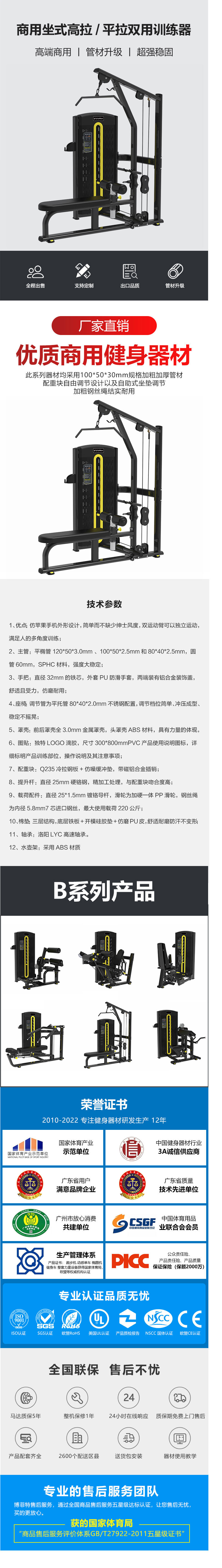 9、載荷配件:直徑25*1.5mm鍍鉻導杆,滑輪為加硬一體PP滑輪,鋼絲繩為內徑5.8mm7芯進口鋼絲,最大使用載荷220公斤;
