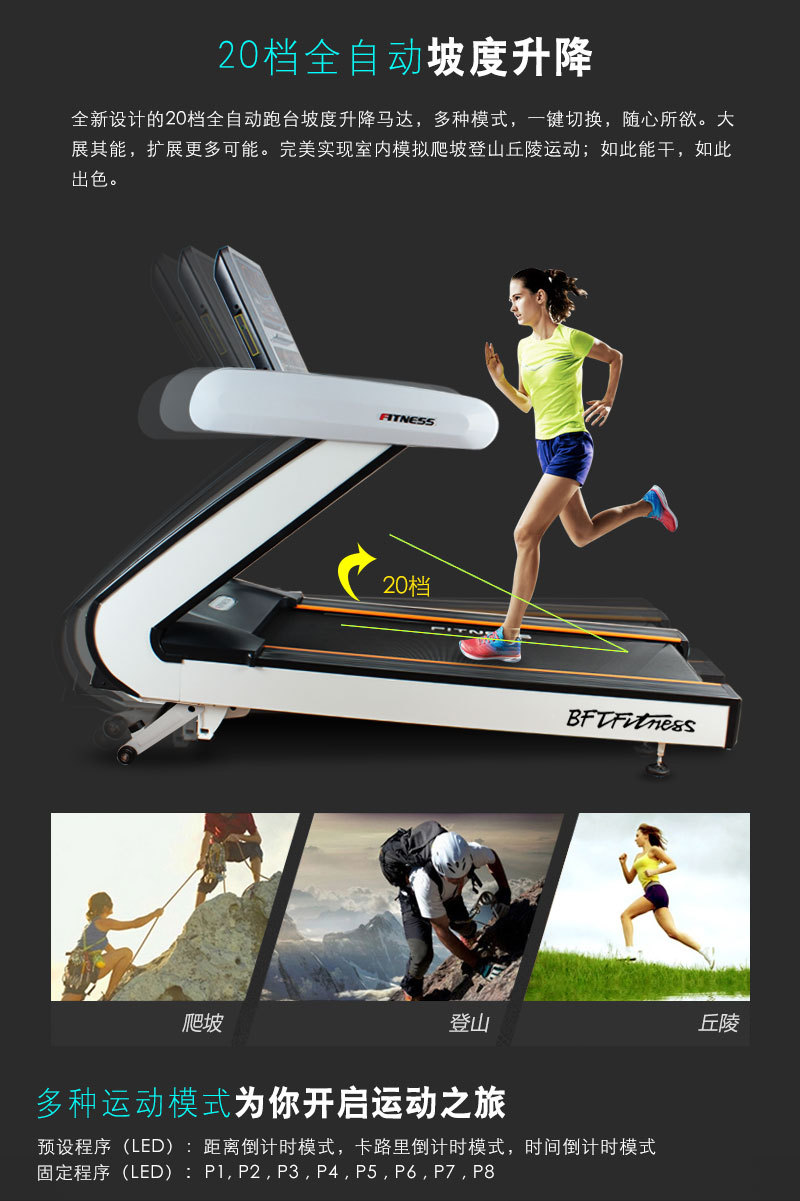 坡度直選功能、軟停止及總裏程記錄功能、心率控製速度功能 |