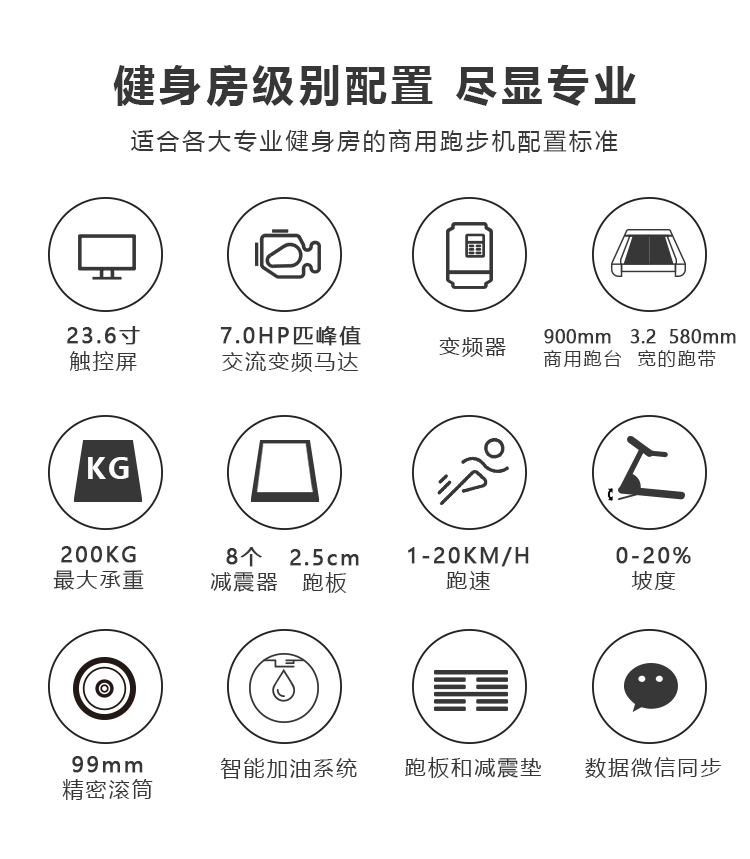加油係統:手動或者自動加油係統;   跑板厚度:25mm 厚的高強度防靜電跑板; 上邊踏板和側邊踏板:高強度加硬PVC材質,立柱: Q235鋼材; 高加強版的整體鋼架結構提高整體跑步機穩定性