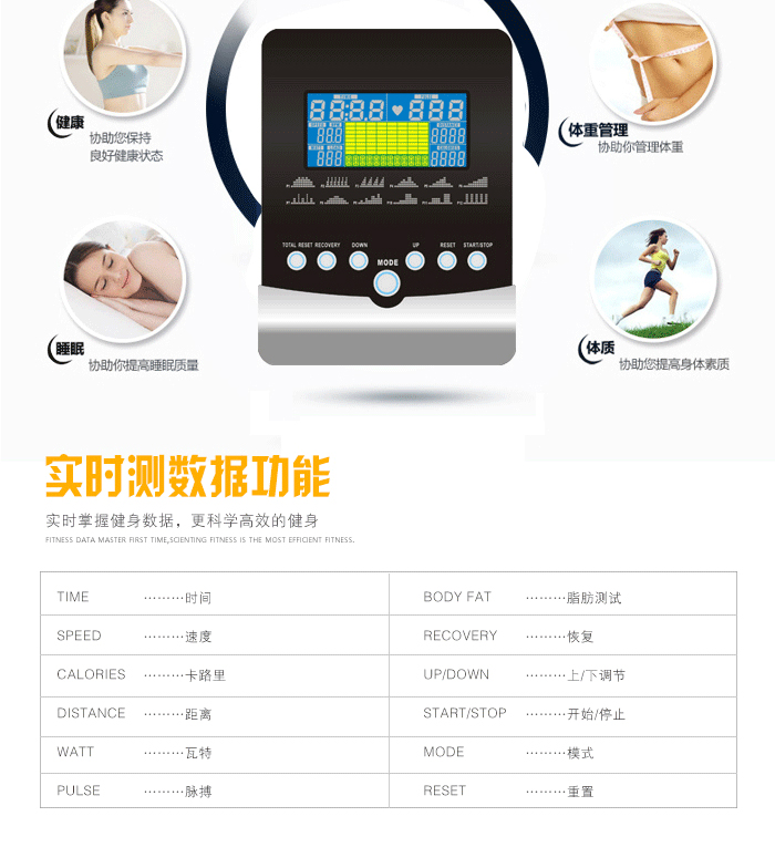 | 心率顯示 | 實時顯示心率,輸入年齡和體重後,可幫助用戶保持在燃脂、有氧或峰值目標區域中,更有效地進進行心肺訓練和減重。 |